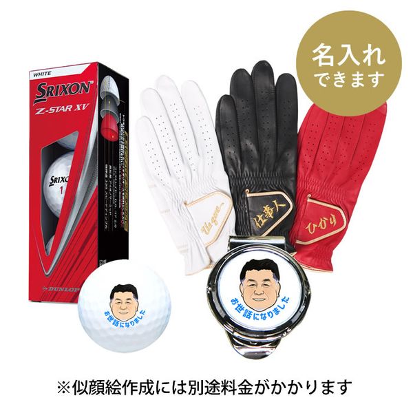 オーダーメイドゴルフグローブお仕立券とオリジナル印刷ボールとクリップ式マーカーのちょっと贅沢なギフトセット。ボールとマーカーにはオリジナルデザイン(1デザイン)で印刷ができます。似顔絵作成には追加料金がかかります。