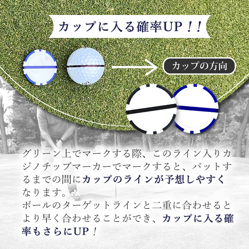 ラインを目印にすることで、打ちたい方向を目で確認しやすくなり、パットの安定を図ります。グリーン上でマークする際、このライン入りカジノチップマーカーでマークすると、パットするまでの間にカップのラインが予想しやすくなります。ボールのターゲットラインと二重に合わせるとより早く合わせることができ、カップに入る確率もさらにUP!