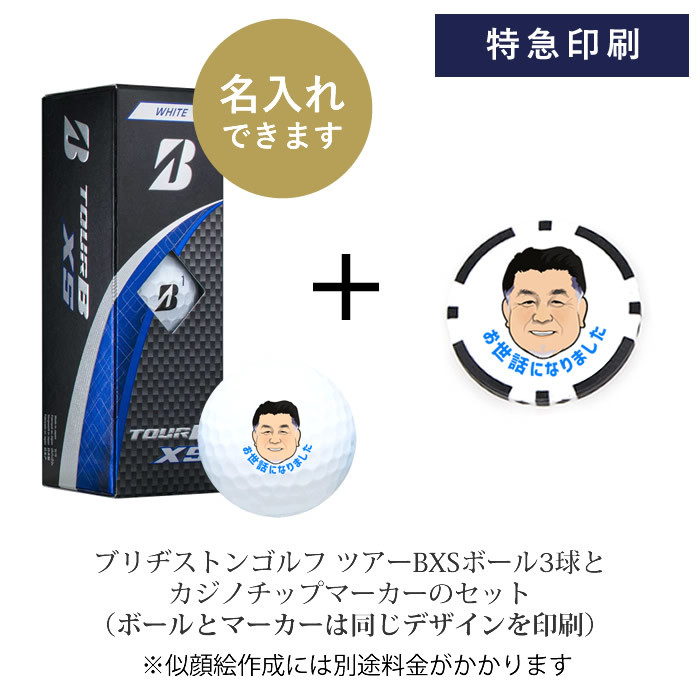 お急ぎの方に、3営業日出荷のゴルフボールとゴルフマーカーのセットです。おそろいのデザインのオリジナル印刷ゴルフボールとゴルフマーカーはプレゼントに最適。ブリヂストンゴルフ ツアーBXSの3球とカジノチップゴルフマーカーのセットです。オリジナルデザイン(1デザイン)で印刷ができます。両面印刷や似顔絵作成には追加料金がかかります。