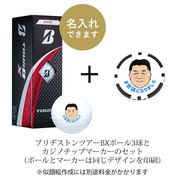 おそろいのデザインのオリジナル印刷ゴルフボールとゴルフマーカーはプレゼントに最適。ブリヂストンゴルフ ツアーBXの3球とカジノチップゴルフマーカーのセットです。オリジナルデザイン(1デザイン)で印刷ができます。両面印刷や似顔絵作成には追加料金がかかります。